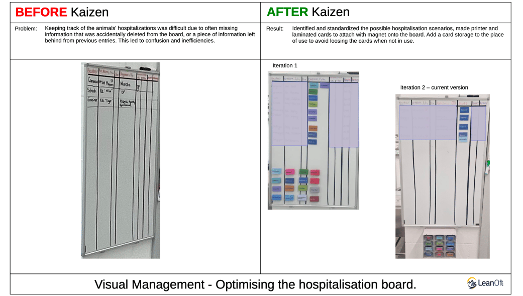 The solution was to identify the various scenarios that could arise during an animal's hospitalisation and create a simple, colour-coded system of cards with magnets on the back. These cards could be placed on a designated board when needed.