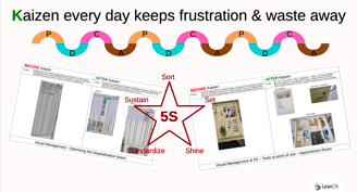 Follow the basic principle: Tools and equipments should be at the point of use and not in a remote “secure” centralized storage place. “A place for everything and everything in its place” – It is the idea that everything should have somewhere to be stored (point of use) and that it should be neatly returned there after use.